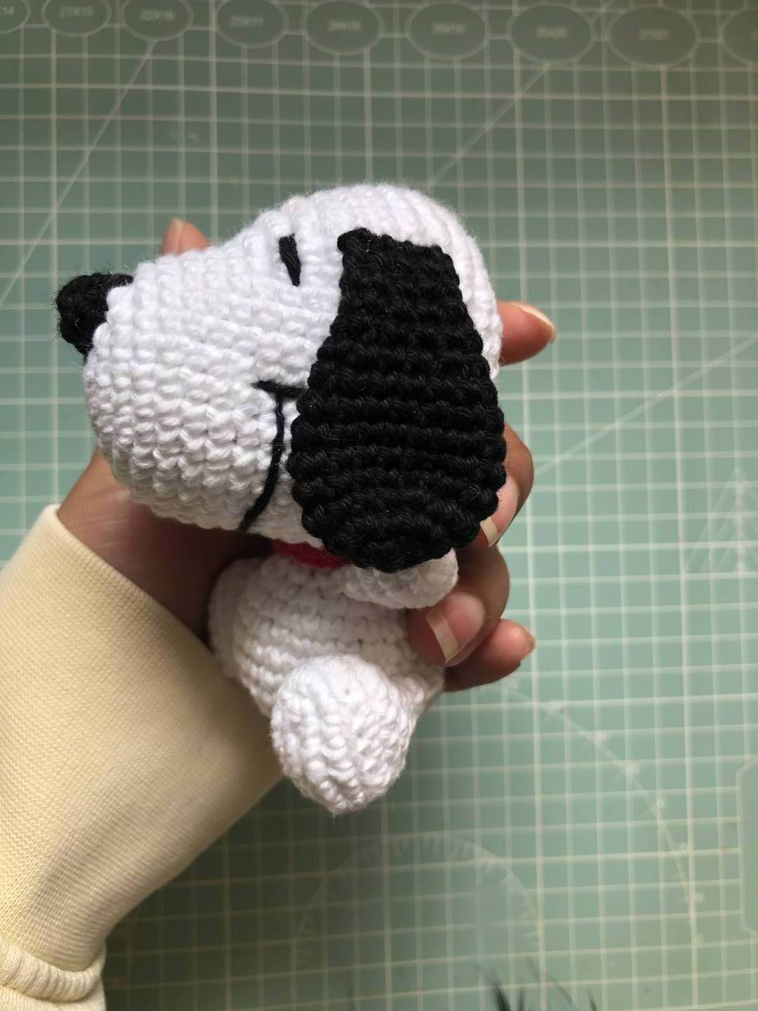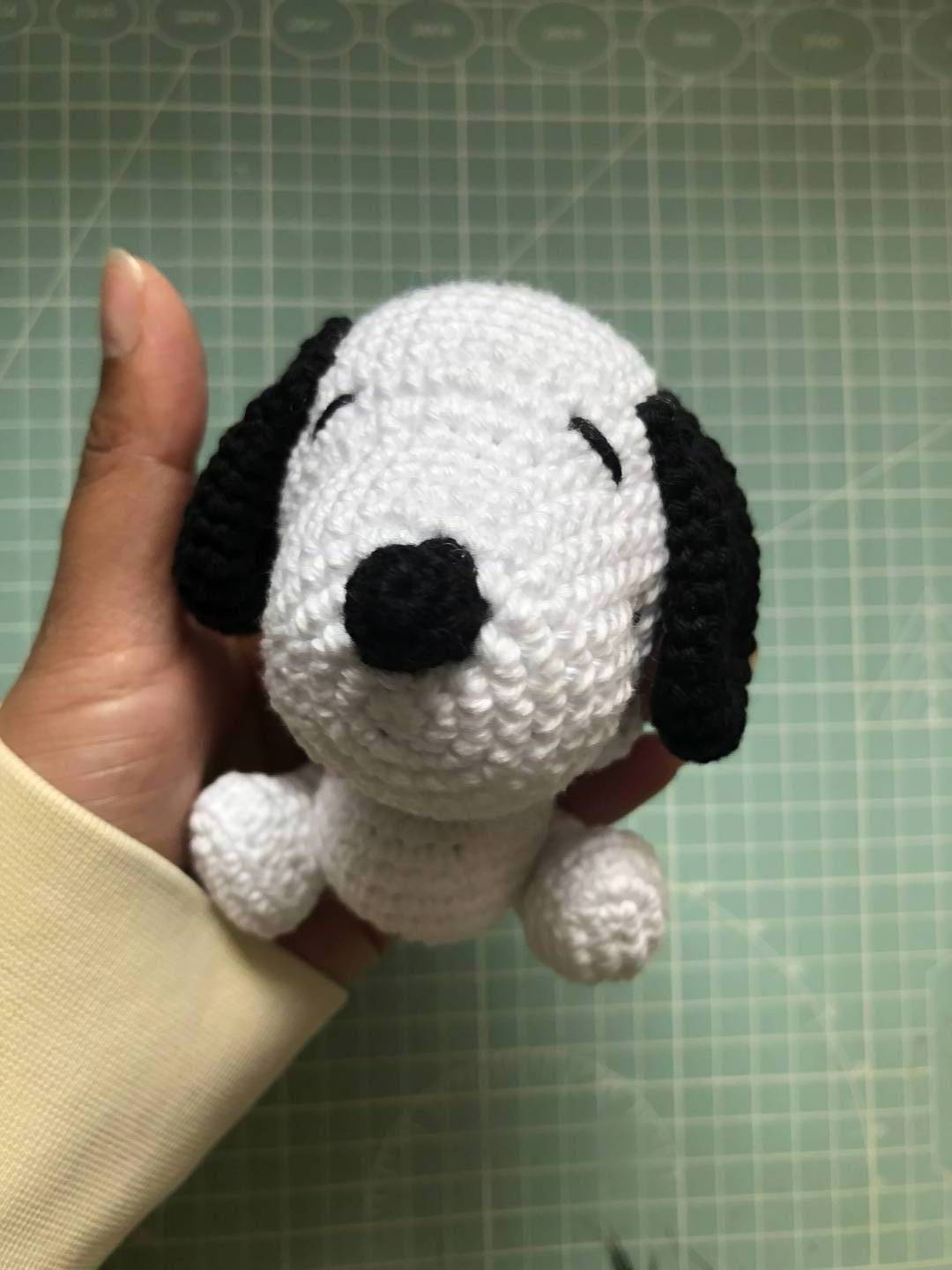 Snoopy ha sido cuidadosamente tejido a mano con estambre 100% algodón en suaves tonos blanco y negro, logrando una textura acogedora y de alta calidad.